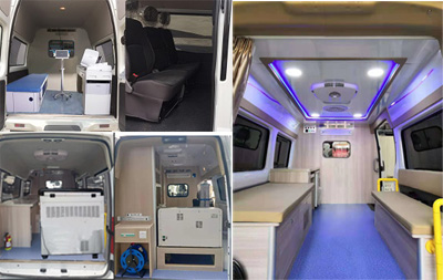 醫療艙內飾具有防腐、防霉、易清洗等特點,便于醫護人員的清潔,整理;座椅均包裹藍色防真皮、車內各面采用圓面設計、造型美觀同時可防止對醫護人員與病患的再次傷害。